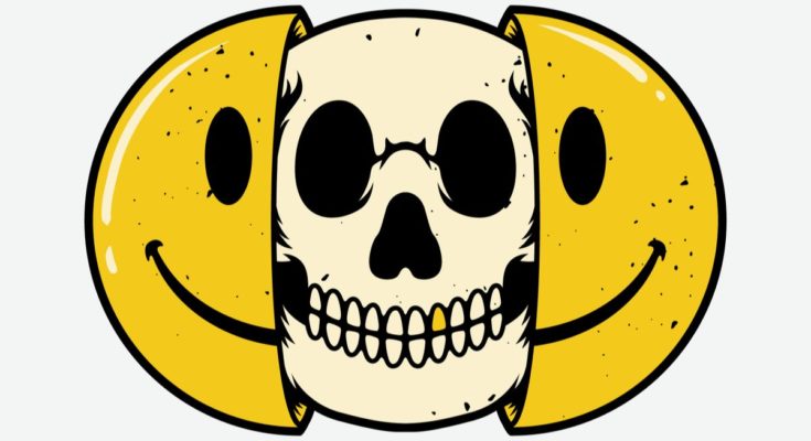 Um emoji de sorriso se abrindo para revelar um emoji de caveira dentro.