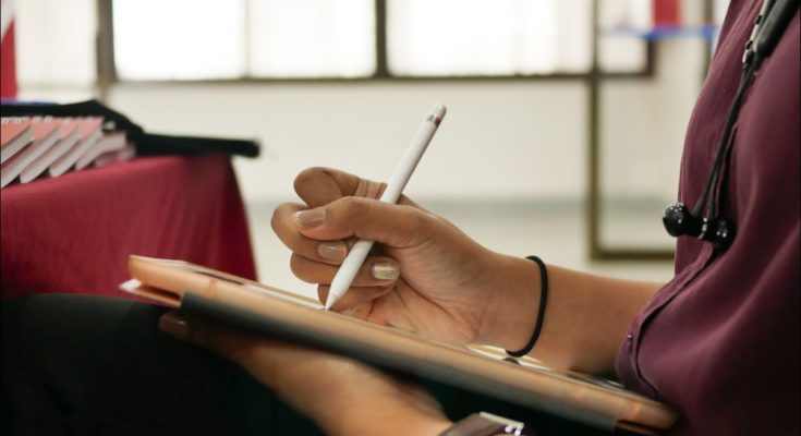 Close das mãos de uma mulher desenhando em um tablet com um lápis