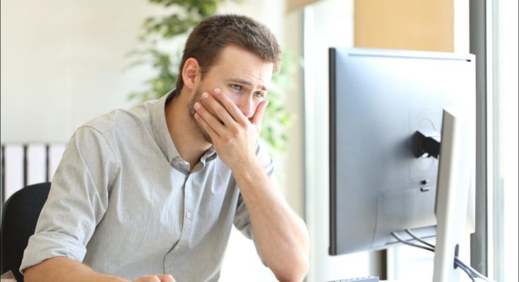 Homem olhando para o computador com expressão chocada, cobrindo a boca.