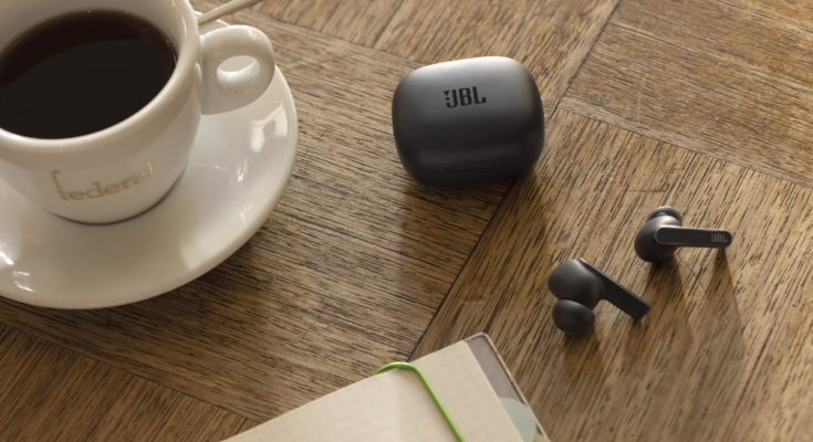 Fones de ouvido JBL Live Pro 2 sobre uma mesa ao lado de uma xícara de café e um notebook