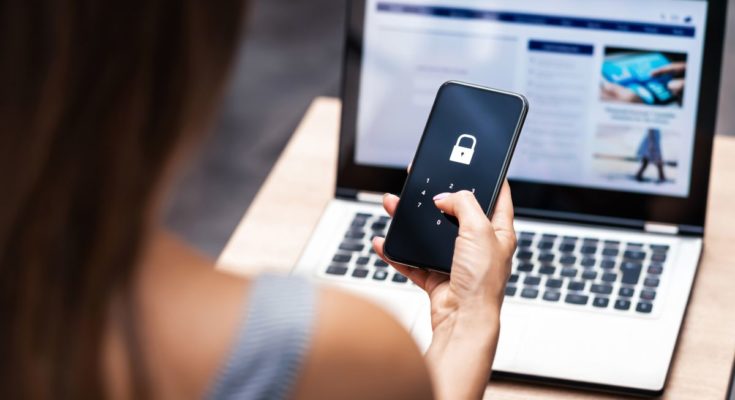 Vista por cima do ombro de uma mulher desbloqueando um smartphone digitando um PIN, com um laptop ao fundo.