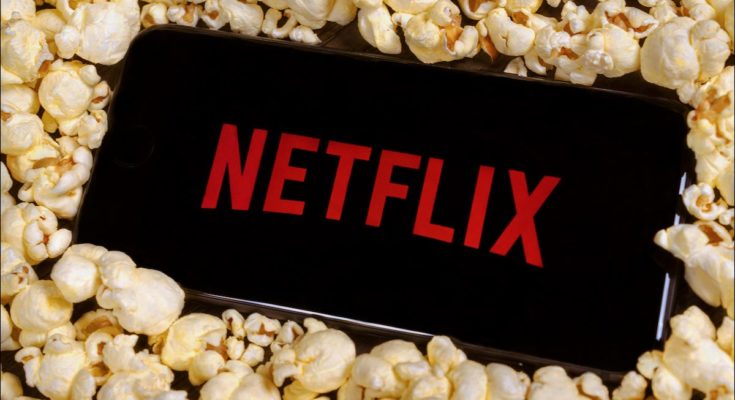 O logotipo da Netflix em um smartphone sobre uma pilha de pipoca