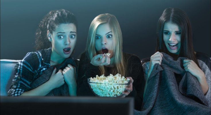 Três jovens assistindo a um filme e comendo pipoca com expressões assustadas.