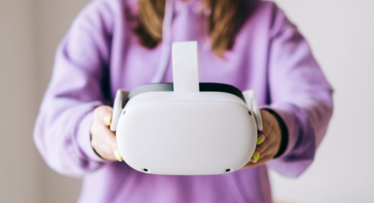 Uma mulher segurando um headset de realidade virtual Oculus Quest 2.