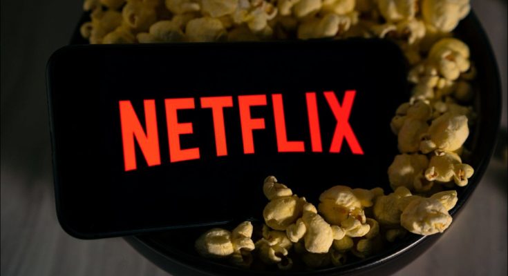 Logotipo da Netflix em um smartphone em uma tigela de pipoca