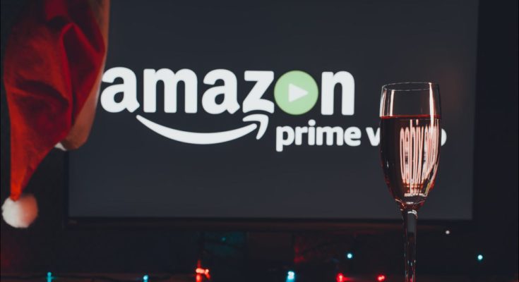 Logotipo do Amazon Prime Video em uma TV com um chapéu de Papai Noel atrás de uma taça de vinho