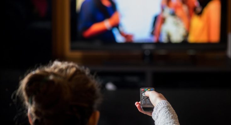 Pessoa apontando um controle remoto em direção a uma TV com o logotipo da Netflix