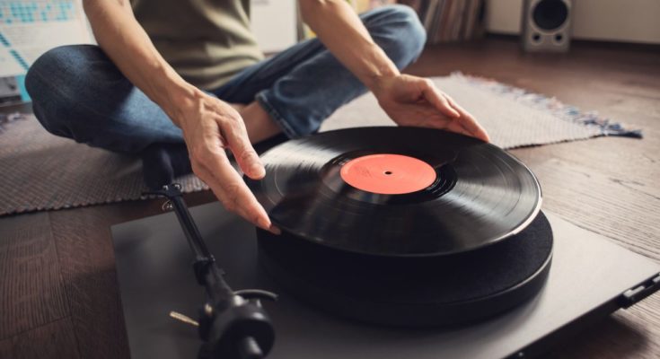 Mãos de mulher colocando um disco de vinil em um toca-discos.