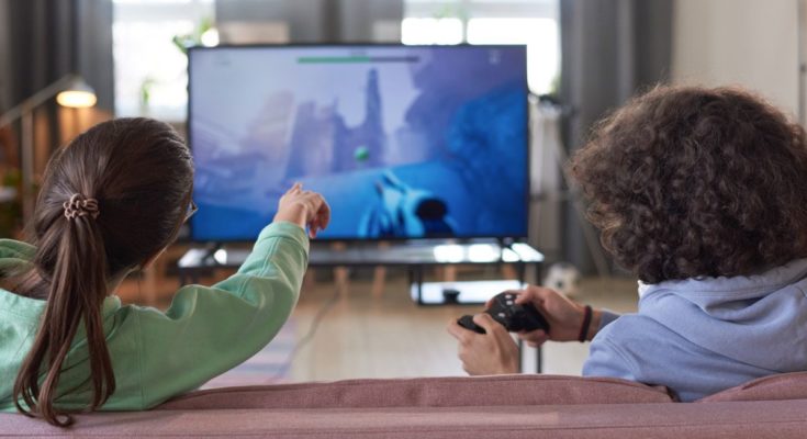Pessoas sentadas em um sofá enquanto jogam videogame na TV.