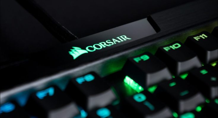 Close de um logotipo da Corsair em um teclado com iluminação RGB.