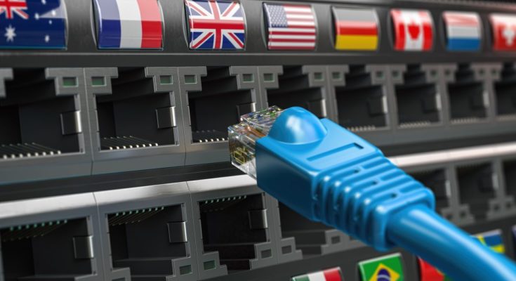 Conectar um cabo Ethernet em portas identificadas com bandeiras de diferentes países.