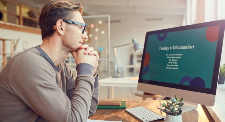 Um homem assistindo a uma apresentação de slides na tela do computador.