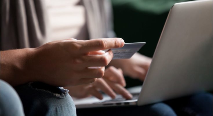 Casal fazendo compras online com laptop e segurando um cartão de crédito