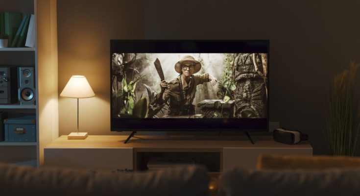 Uma TV na sala de estar com um filme de aventura em exibição.