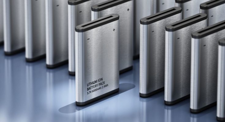 Um conjunto de baterias de íon de lítio com uma destacada.