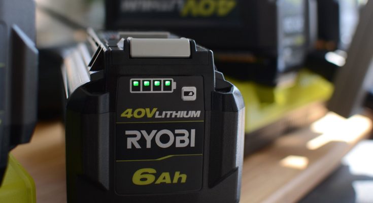 Uma visão aproximada de um medidor Kill A Watt carregando algumas baterias Ryobi.