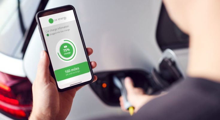 Pessoa carregando um carro elétrico enquanto observa a taxa de carga em seu smartphone.