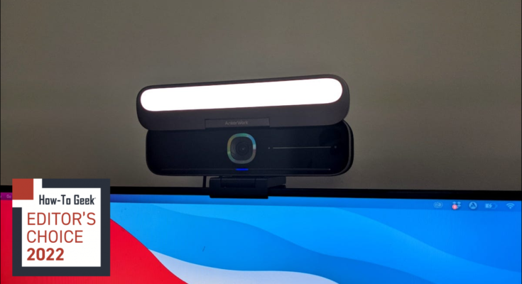 Se você não estiver usando a câmera ou quiser embalá-la para levar com você, a barra de luz se dobra para baixo e funciona como uma tampa para a lente. Os requisitos de energia o tornam um pouco volumoso para uma webcam “em movimento”, mas é absolutamente uma opção.