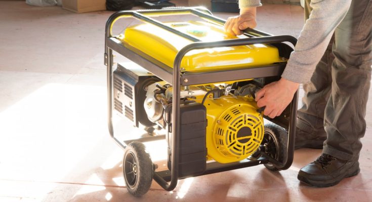 Pessoa operando um gerador portátil a gasolina amarelo.