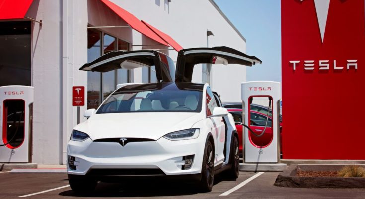 Carro Tesla conectado a uma estação de carregamento e com as portas em forma de asa de falcão abertas.