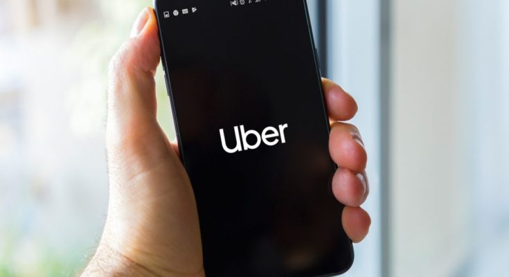 Uma mão segurando um smartphone exibindo o logotipo da Uber.