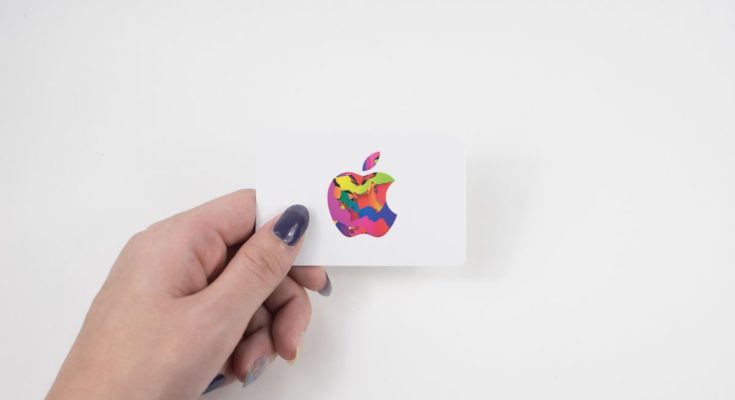 A mão de uma pessoa segurando um vale-presente da Apple contra um fundo branco.