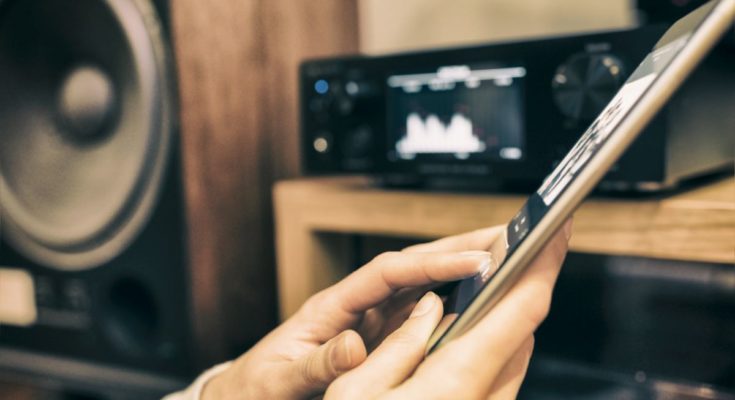 Closeup de mãos controlando um sistema de áudio doméstico com um tablet.
